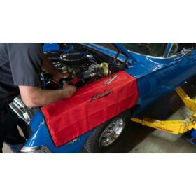 Protect your vehicles front fender with the Lisle 89880 Red Fender Cover. The Red Fender Cover has a non-slip rubber backing that helps keep the Cover in place without the need of magnets that can scratch or ruin your paint. This cover is grease, oil, and water resistant, as well as machine washable.
